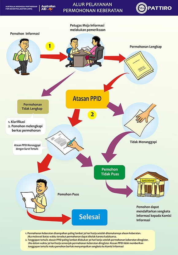 Jika keberatan tidak ditanggapi atau tidak memuaskan, pemohon dapat mengajukan penyelesaian sengketa informasi kepada Komisi Informasi sesuai ketentuan UU No.14 Tahun 2008.